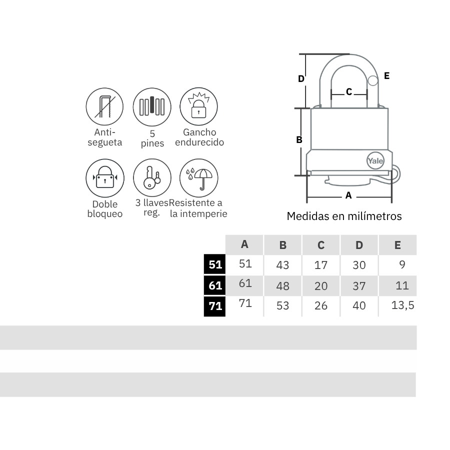 Todos los candados Yale han sido evaluados con pruebas de corrosión aceleradas donde se comprueba su nivel de tolerancia a condiciones ambientales extremas. Resistentes a diferentes condiciones de intemperie, en esta sección encontrará candados apropiados para condiciones ambientales específicas.